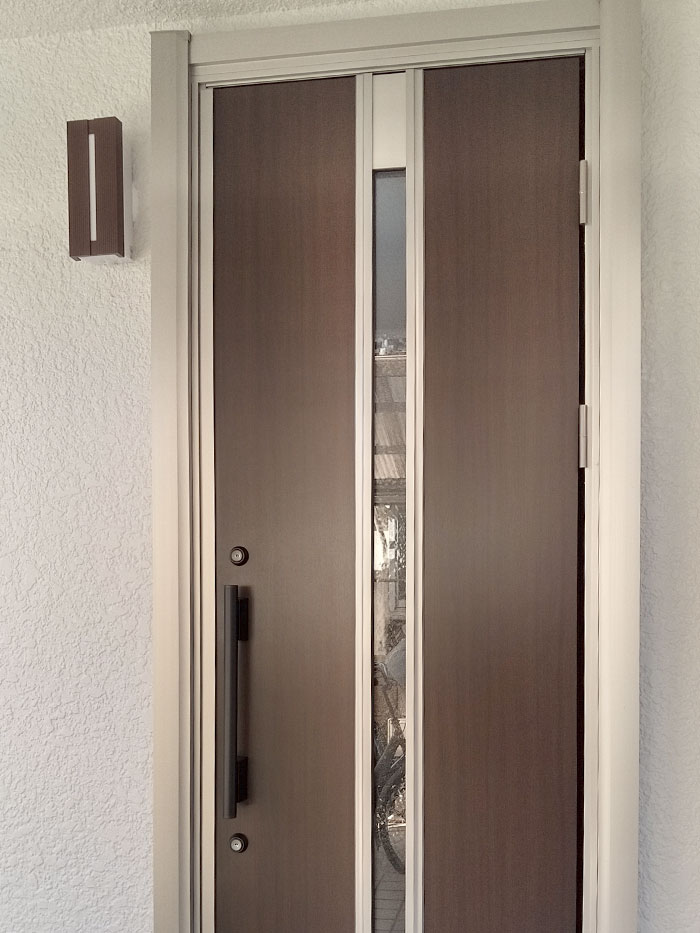 玄関扉だけでなく、周辺の照明器具も年数が経っているので、扉・照明を同時に交換し空間を一新しました。